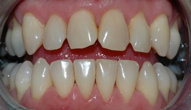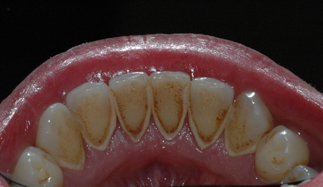 Her kan man se misfarging og tannsten på tennenes fremside.