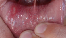 After er små, smertefulle sår som opptrer i munnhulen. Sårene er runde eller ovale og dekket av en gulaktig hinne med en hissig, rød sone rundt. Sårene måler vanligvis 4 - 8 millimeter i diameter, og de forsvinner av seg selv i løpet av 1 - 2 uker.